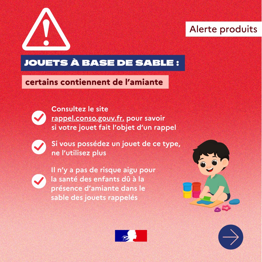 La Direction Générale de la Concurrence, de la Consommation et de la Répression des Fraudes (DGCCRF) a publié une alerte concernant certains jouets pour enfants à base de sable susceptibles de contenir de l’amiante.